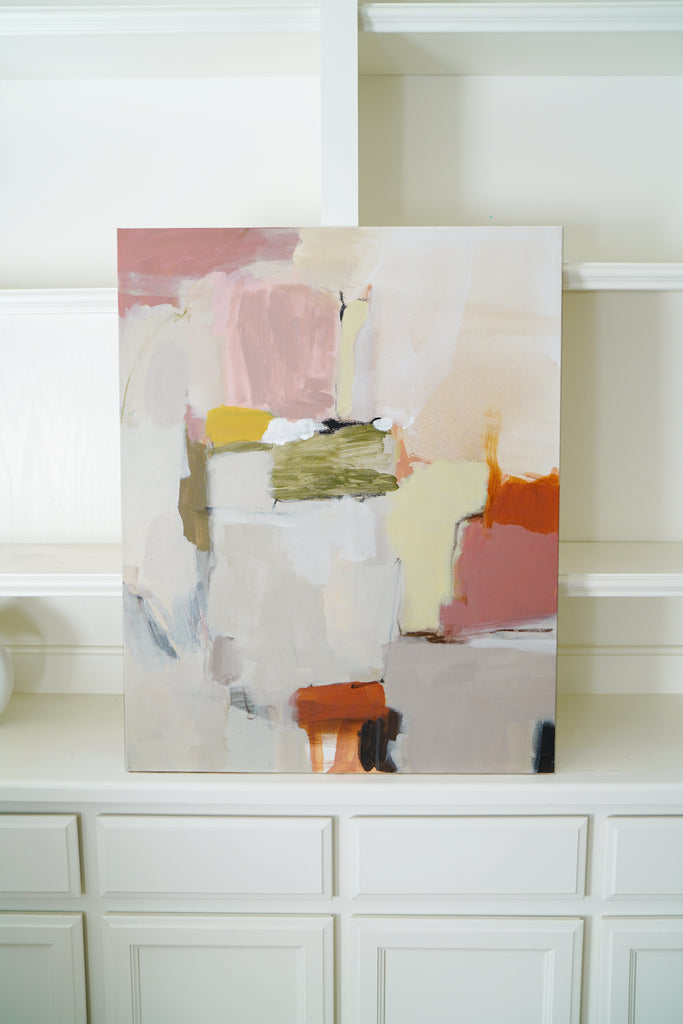 This painting is a delicate beauty preserved by the freshness and fragrance of a summer day, and the color of a rose gradually alluring under the sun. Softly neutral colors and muted pink, yellow-green, and olive blend into a harmonious composition, capturing the emotion and charm of nature's changing colors.