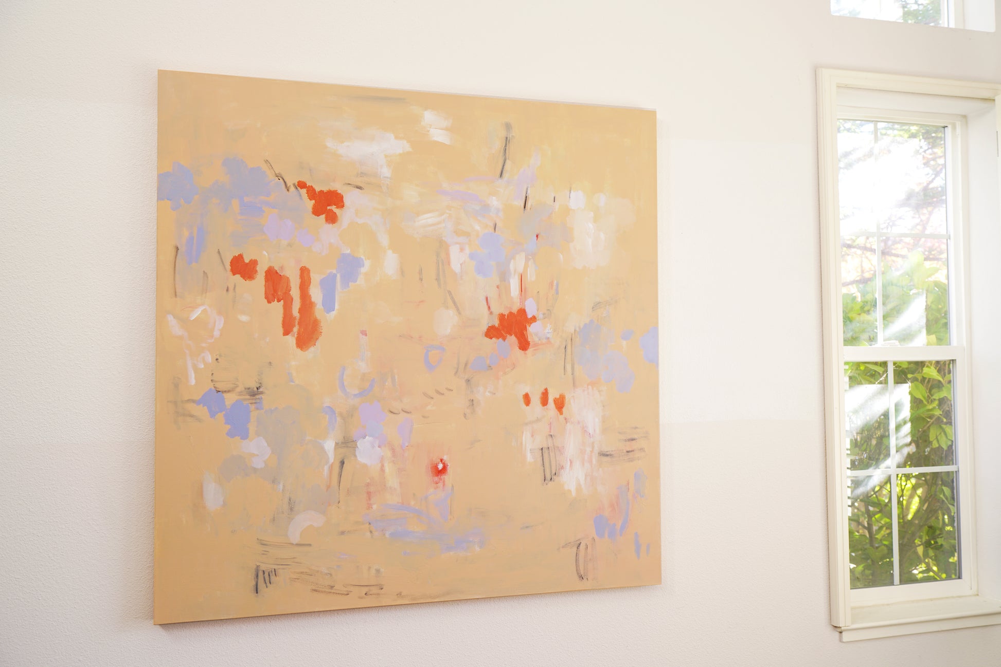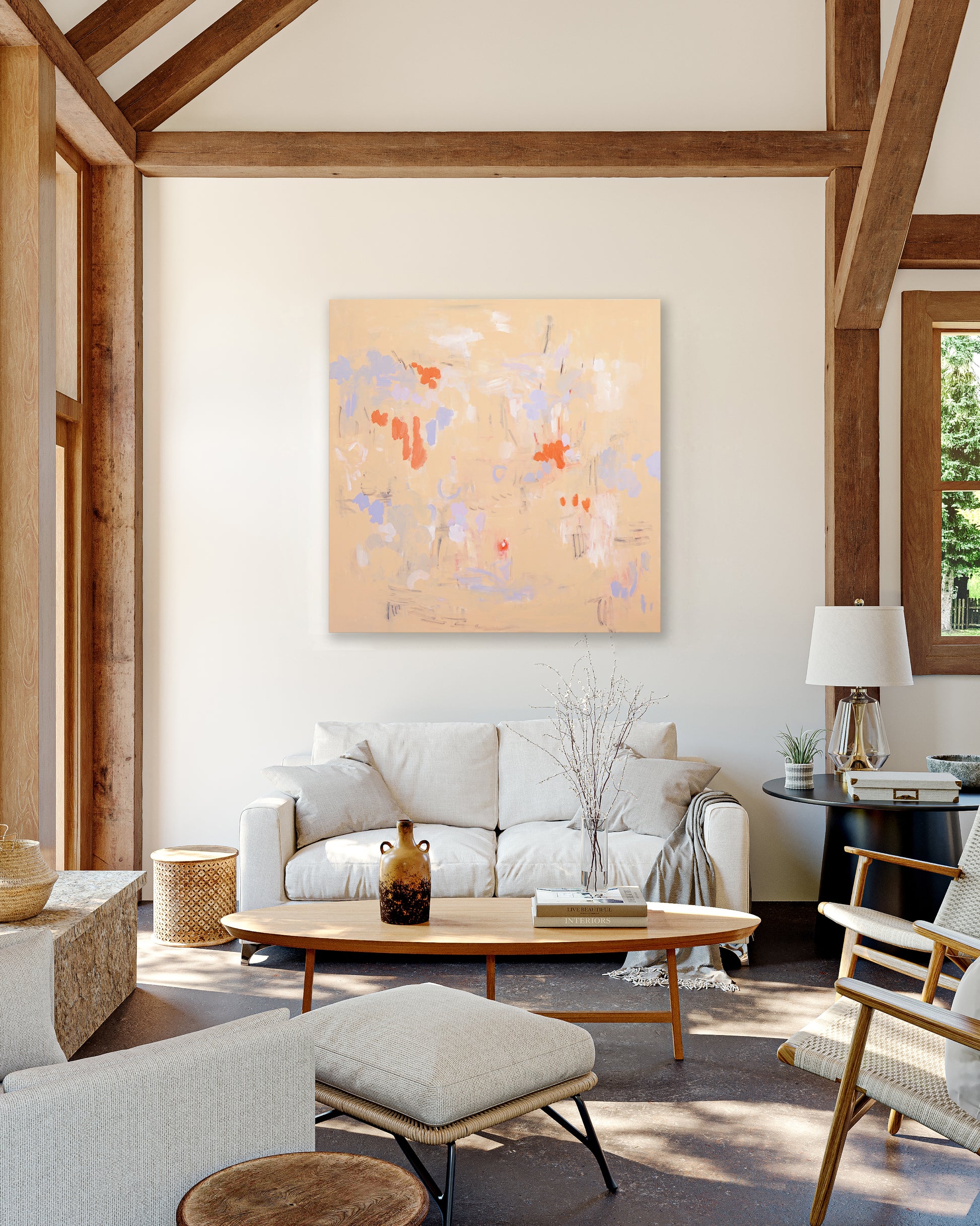 This piece captures the gentle warmth of a sunlit field bathed in soft peach tones. Through impressionistic abstraction, it evokes the delicate movement of poppy blooms swaying among nameless wildflowers in a tender breeze. Layers of color and light create a subtle afterimage of nature’s quiet radiance—an atmosphere both serene and quietly alive, embodying an inner vitality that flows with calm, graceful energy.