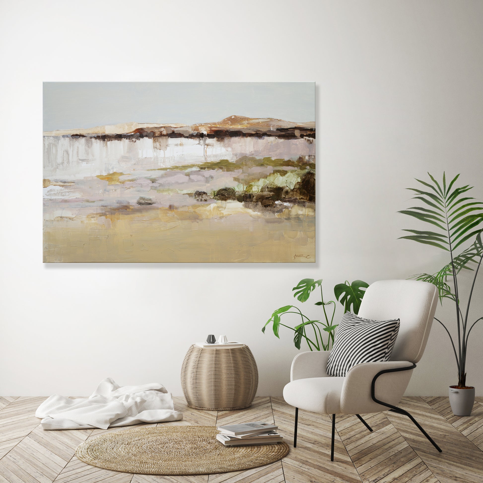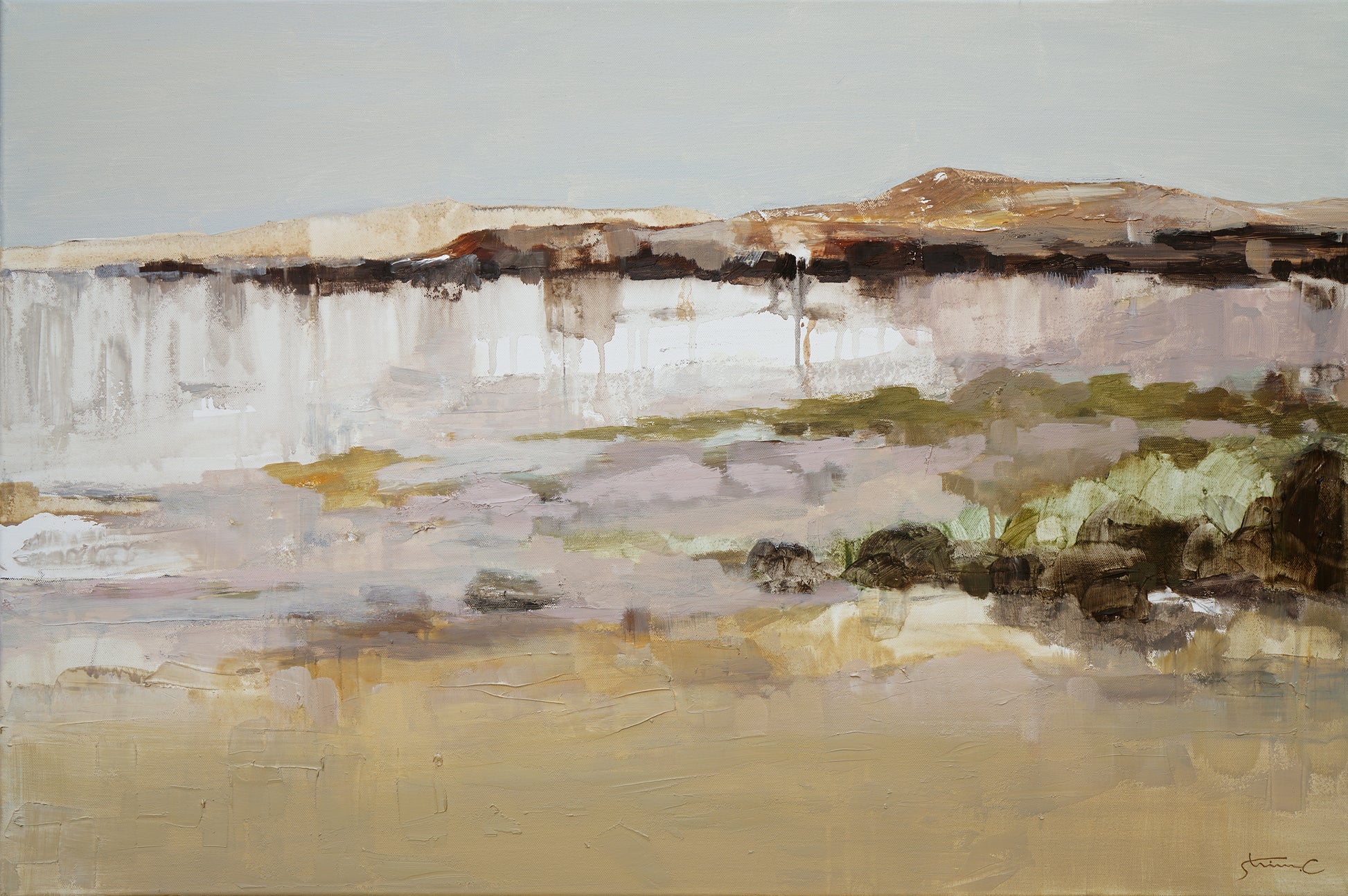 This painting captures a serene and warm atmosphere, rendered in earthy tones that evoke the beauty of nature. The palette features soft beige, muted browns, and gentle greens, creating a harmonious and grounding effect. In the distance, undulating mountain ridges fade into the horizon, while the foreground opens into an expansive field. The lush brushstrokes and textured paint surface add a tactile depth, inviting the viewer to feel the energy of the landscape. With its contemporary style, this piece offers a modern yet timeless interpretation of natural scenery.