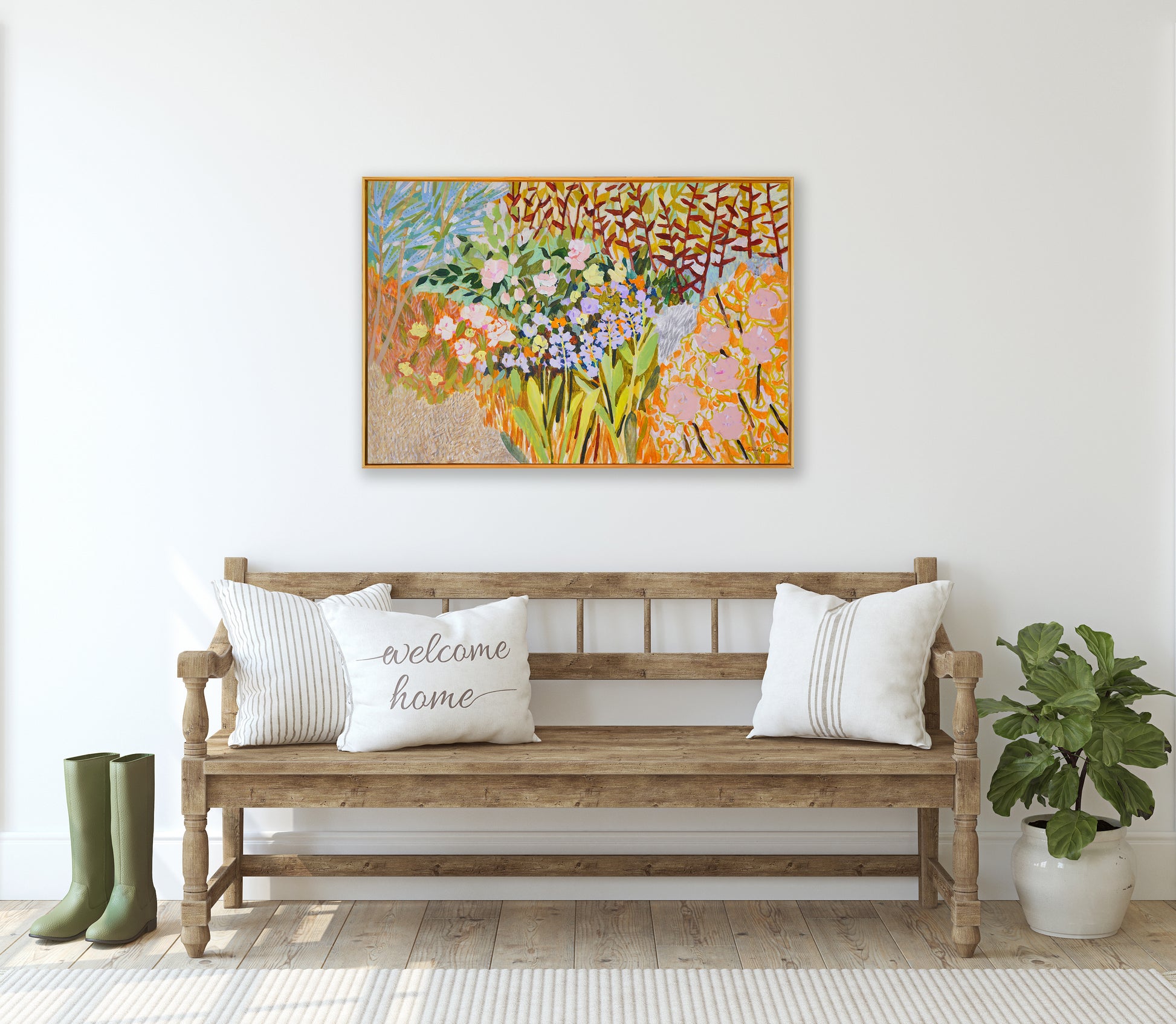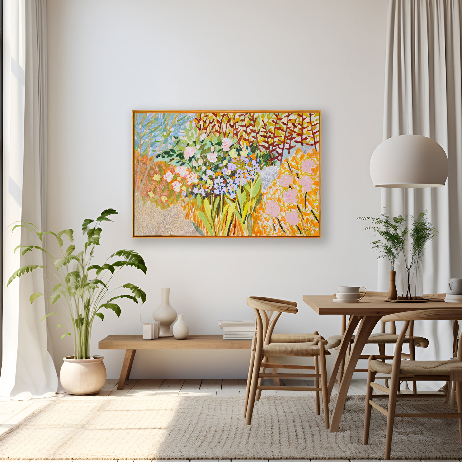 This piece captures a lush burst of botanical energy, blending layered blooms, shifting colors, and rhythmic brushwork. Soft roses anchor the composition while vibrant flowers unfold around them, creating a lively harmony of texture and movement. The artwork brings a warm, uplifting presence to any space, echoing the feeling of a flourishing garden in full bloom.