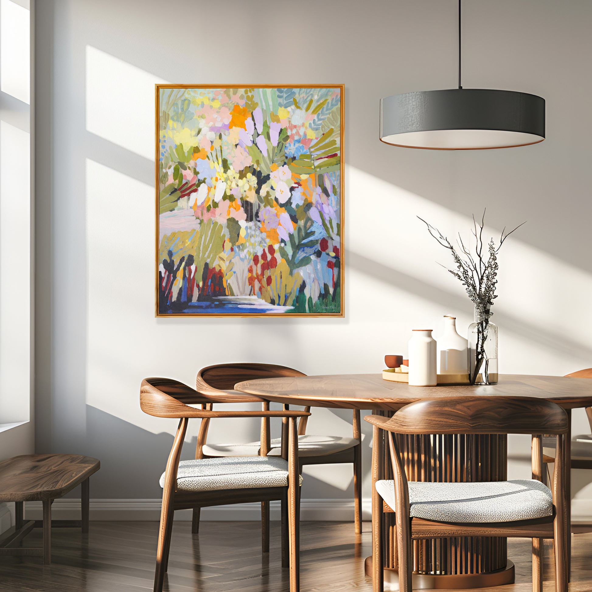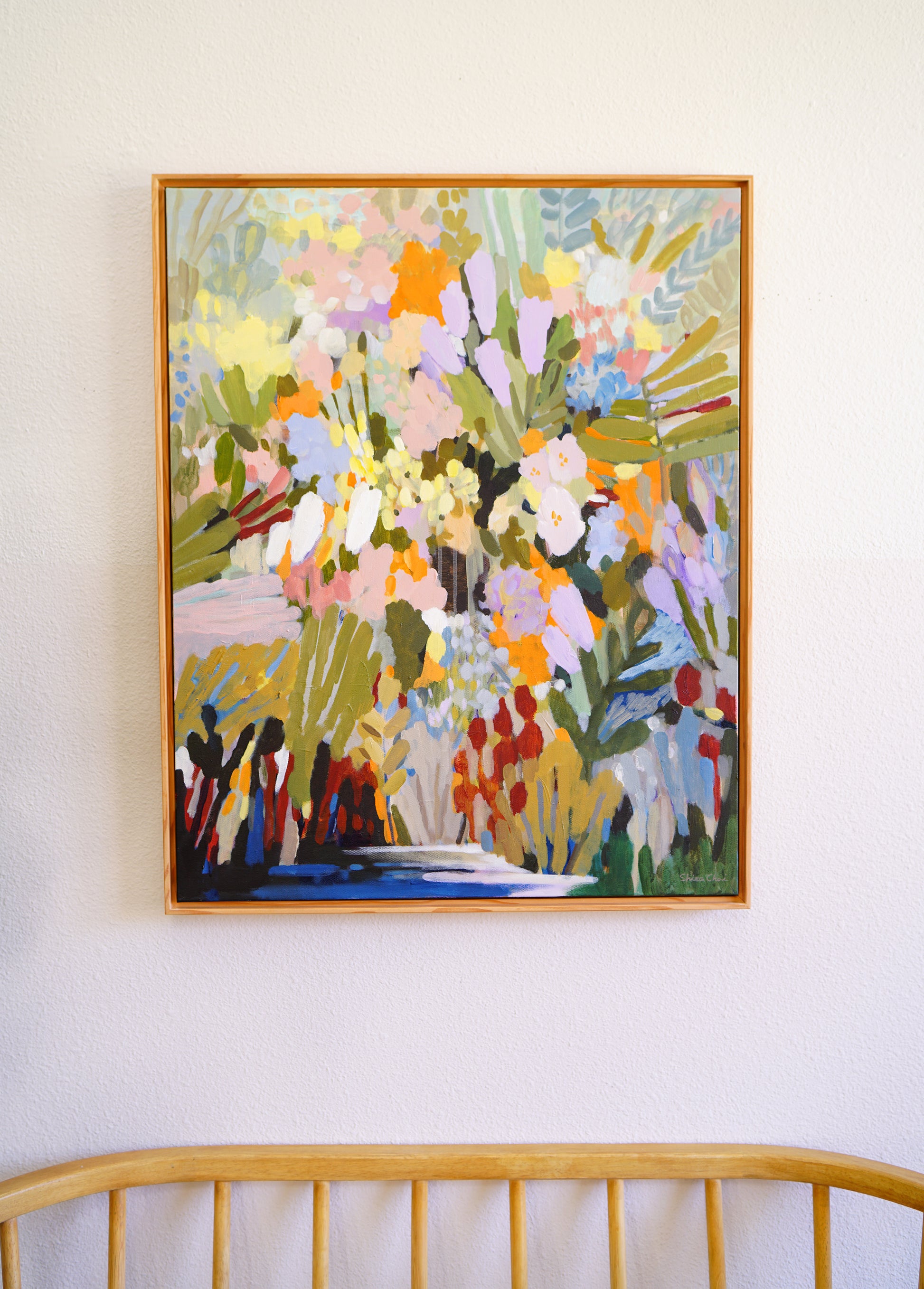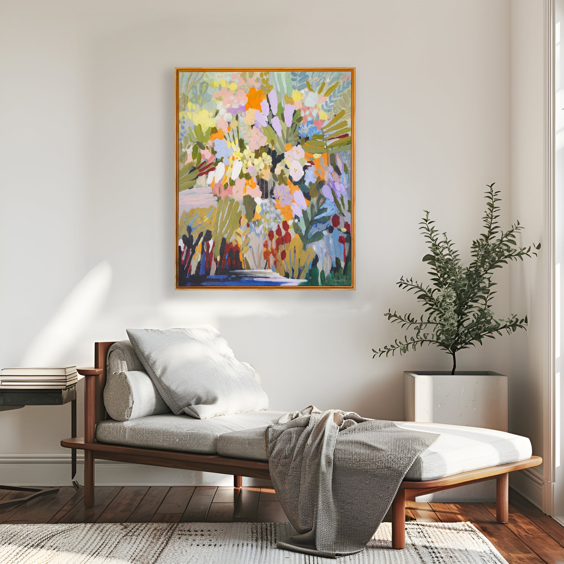 This piece was created while imagining a quiet moment beneath flower vines that gently filter the light. Warm corals, calm greens, and soft yellows flow in organic shapes, shifting between pattern and landscape. It isn’t a real place but a hidden corner of the woods that exists somewhere between memory and imagination, a world you slip into rather than discover. It carries the serene feeling of being held by nature, as if becoming one with it.