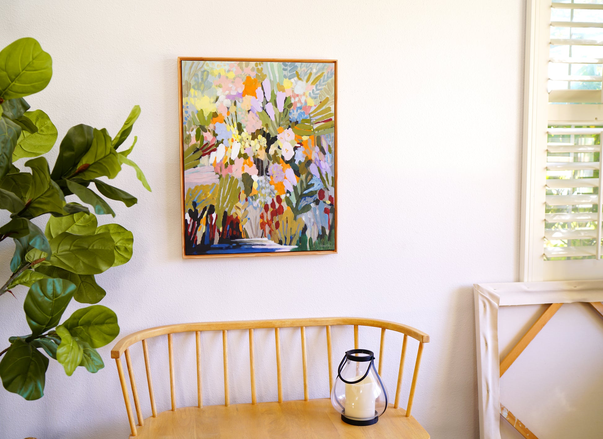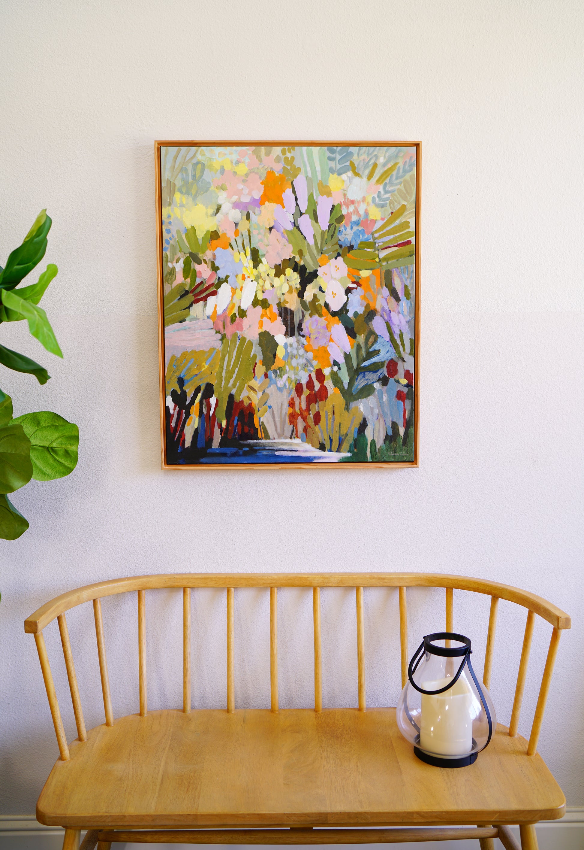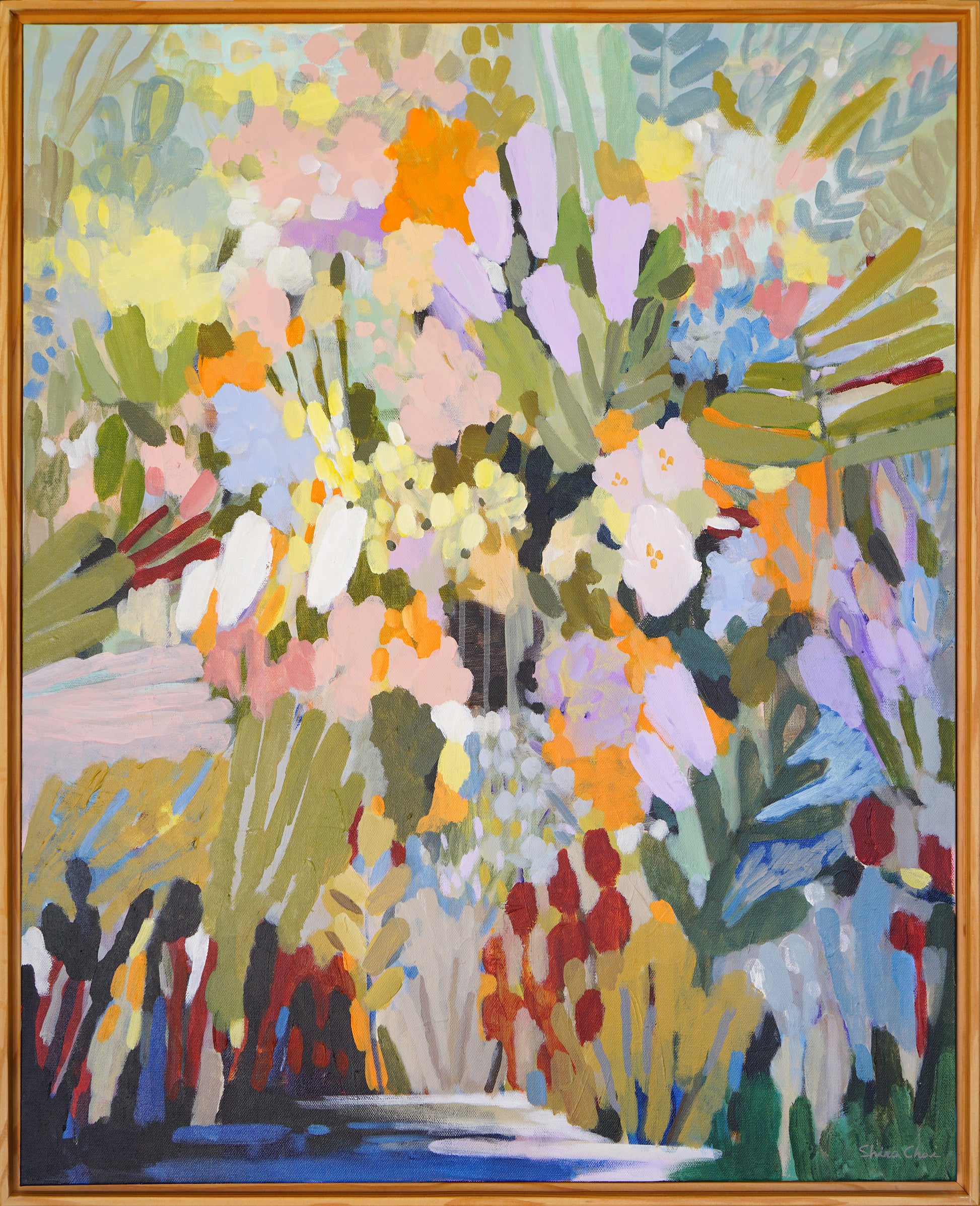 This piece was created while imagining a quiet moment beneath flower vines that gently filter the light. Warm corals, calm greens, and soft yellows flow in organic shapes, shifting between pattern and landscape. It isn’t a real place but a hidden corner of the woods that exists somewhere between memory and imagination, a world you slip into rather than discover. It carries the serene feeling of being held by nature, as if becoming one with it.