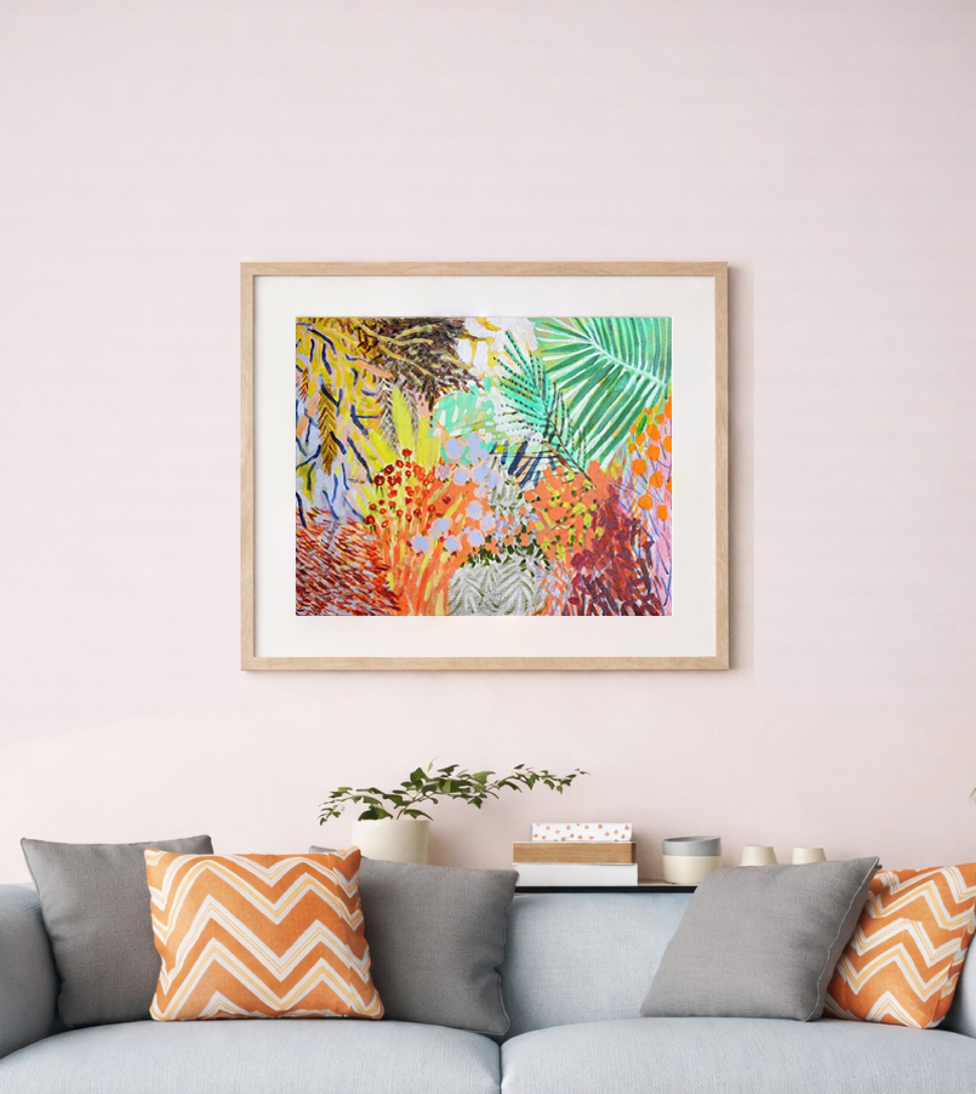 Layers of tropical foliage unfold in warm light, blending vibrant colors with organic movement. This piece evokes the feeling of stepping into a lush, sunlit garden where energy and calm coexist naturally.